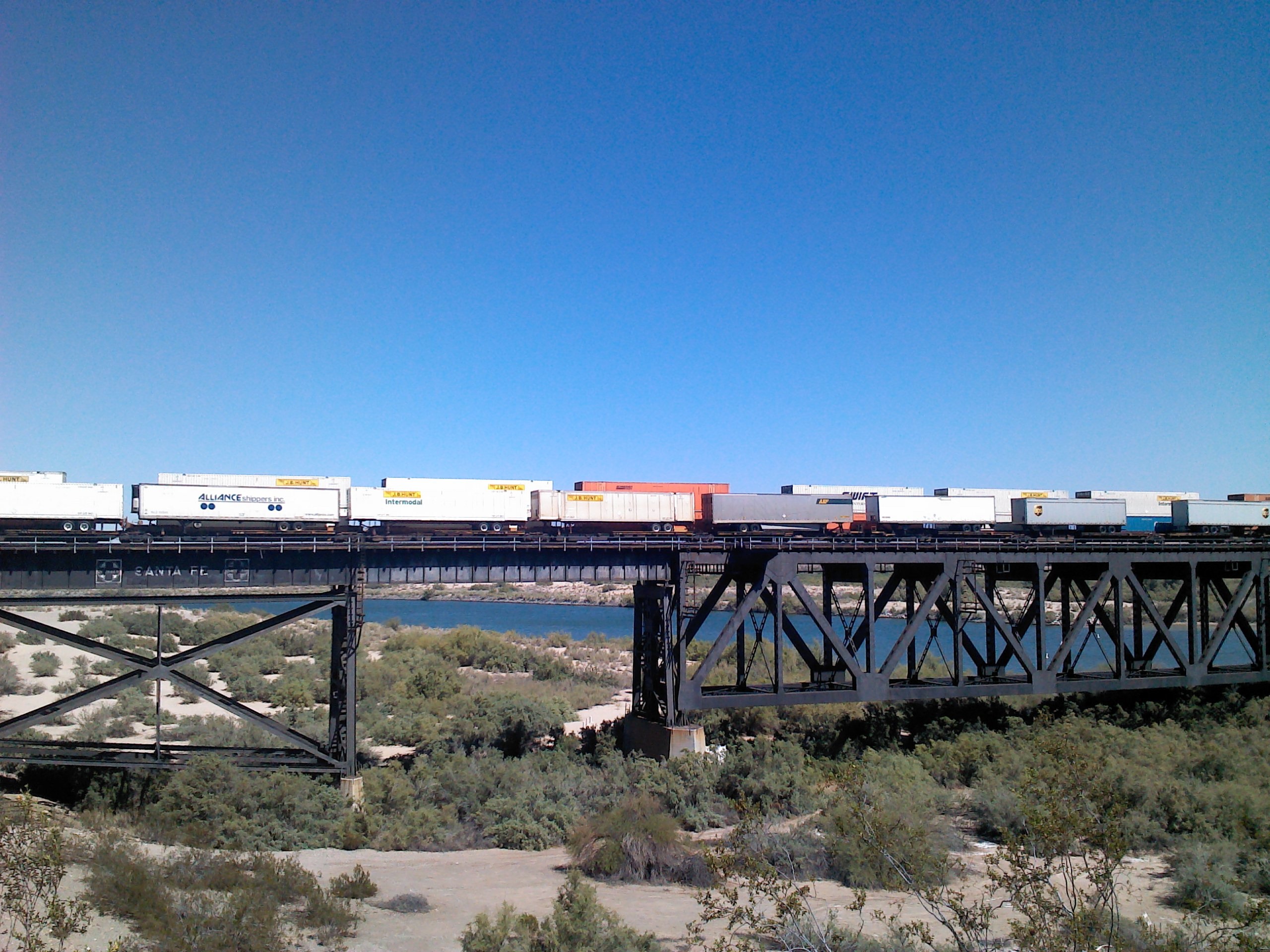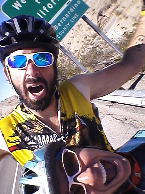 Pretty soon after crossing the river, a CA cop, Officer Fox, pulled us over. “You can’t ride bikes on the freeway, man!” Oops. There’s really no other to go to get where we want to be, and we explain our cross country craziness ride to him, so he gives us the green light. “You’re good until Barstow and new jurisdiction.” Roll on.