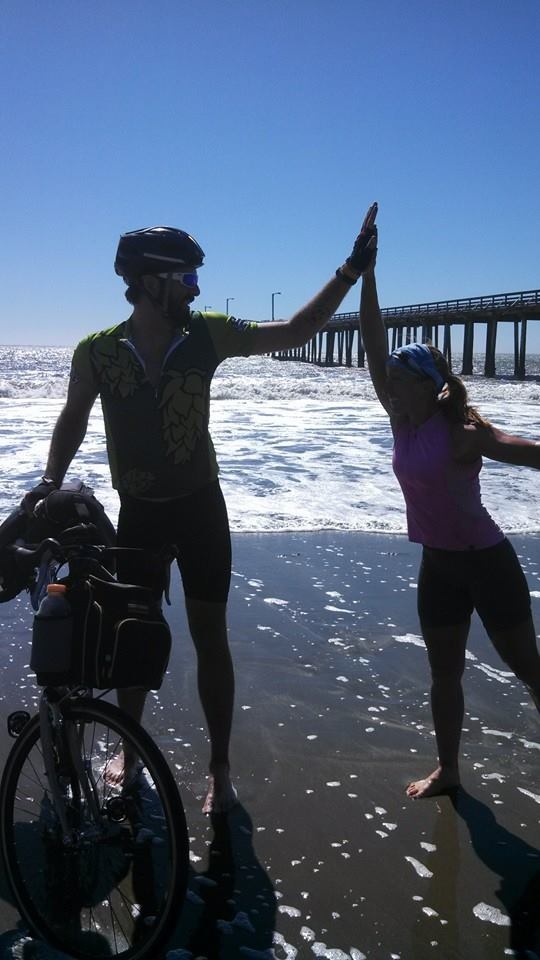 We rode up to the pier, found the family and Joey introduced us to the owner of a beach shop and told him about our ride. We then ran to the ocean. I did a cartwheel, Jacob dipped his tire, we high fived, and then we both dove in.