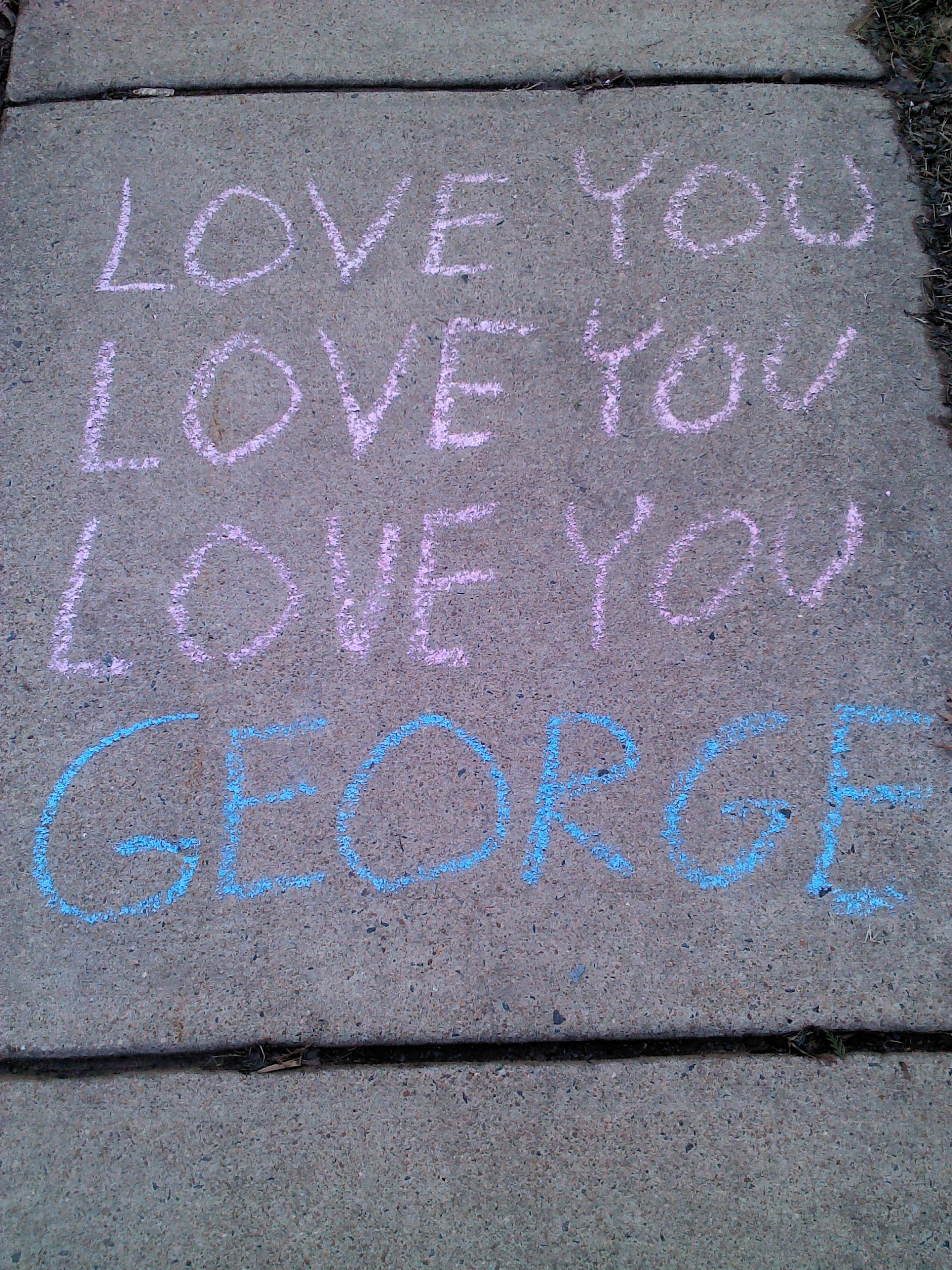 On our run this morning, Melinda and I saw some nice sidewalk-chalking. This is not the first time we’ve seen similar artwork. In fact, 75% of the times we run our George Mason/Lexington route (together or separately about once a week), the art is there. George, who are you? (And do you have two single brothers for us to date?) Here are our thoughts: